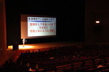 「一日でも長く現役生活を続けるためには、リハビリより予防が重要」という内容で、今、選手たちが取り組めることを熱く伝え、参加した選手・学校関係者の皆様は真剣に耳を傾けていました。