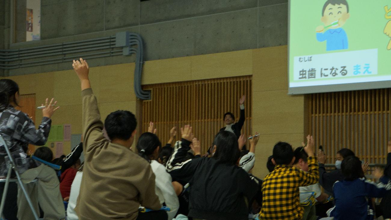 授業の一環として、6年生約90名の児童に対し、予防の重要性を日頃から実践できることも交えた参加型の講演を行いました。 講演後には、児童の皆さんや教職員の皆さんからたくさんの感謝の言葉をいただきました。